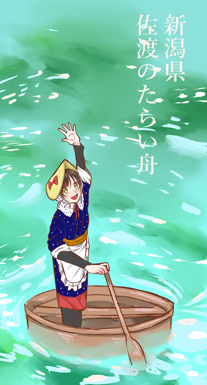 佐渡名物のたらい舟、地域的にもビジュアル的にもとても良い視点で、マンガデザインにすると、まさに映えますね。素晴らしい作品です。たらい舟が考案されたのは1868年ごろ、明治時代で、すごい歴史ですね。洗濯桶から改良に改良を重ね現在のたらい舟になったと言われています。お客さんが乗っていると用途がわかって、もっとよかったですね。