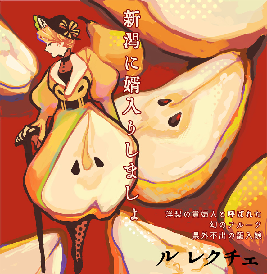 ル レクチェを貴婦人として擬人化し、箱入り娘と貴婦人らしいわがままとして「婿入り要求」をキャッチコピーに。レトロなオシャレ感を目指しつつ、新潟に来たくなるような上品な世界観を作りました。襟元はカットしたル レクチェをイメージしています。