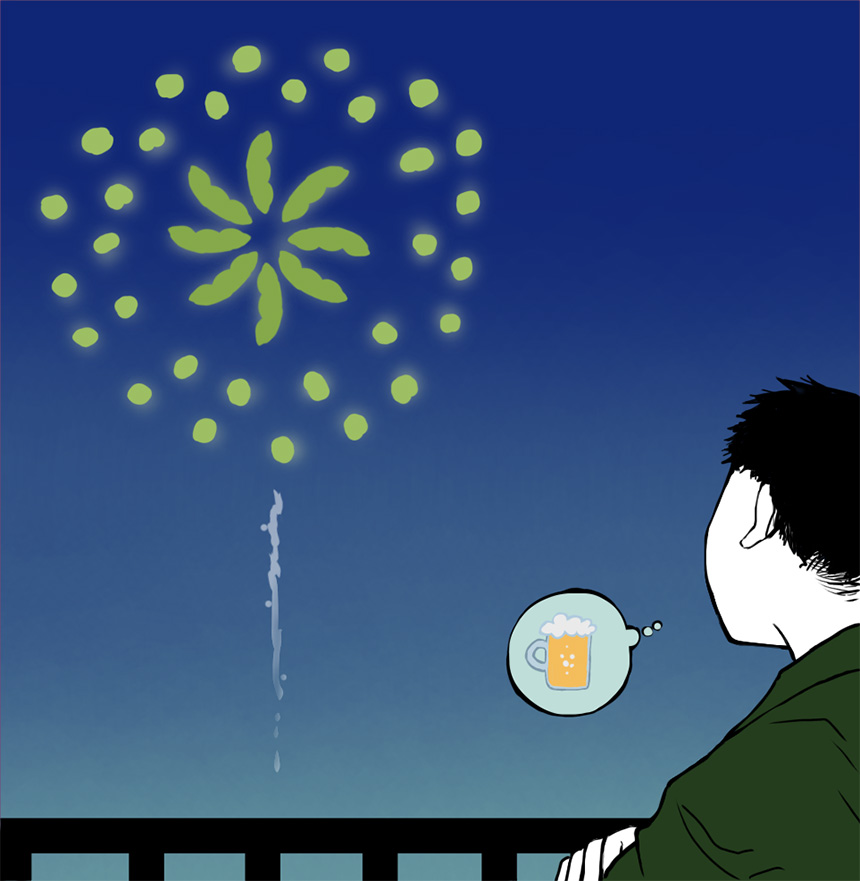 新潟県は「枝豆県」と呼ばれるくらい枝豆の作付面積と消費量が16年間全国1位が続いています。そして、新潟県では大きな花火が打ち上げられることで有名です。その花火を枝豆に変えました。そして、その花火を眺めている男性が枝豆花火を見てビールを飲みたくなっている様子を描きました。