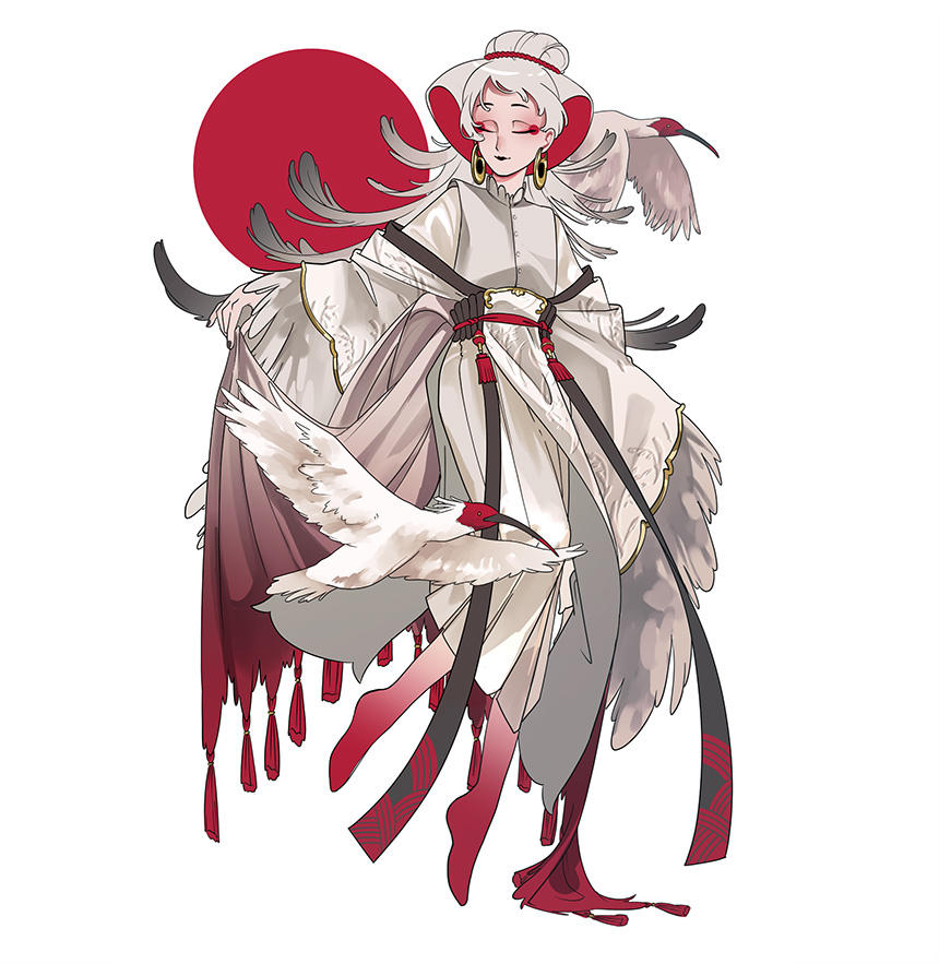 最近色々な地方で地方の特産品などを擬人化しているものを見たので描いてみました。髪や服の裾、帯の裾をトキの羽をイメージ、トキの赤い部分を足先や目の周りを髪の内側に配置しました。耳飾りはトキの瞳をイメージしたものにし、服の柄は新潟で有名な米(稲)の柄にしました。
