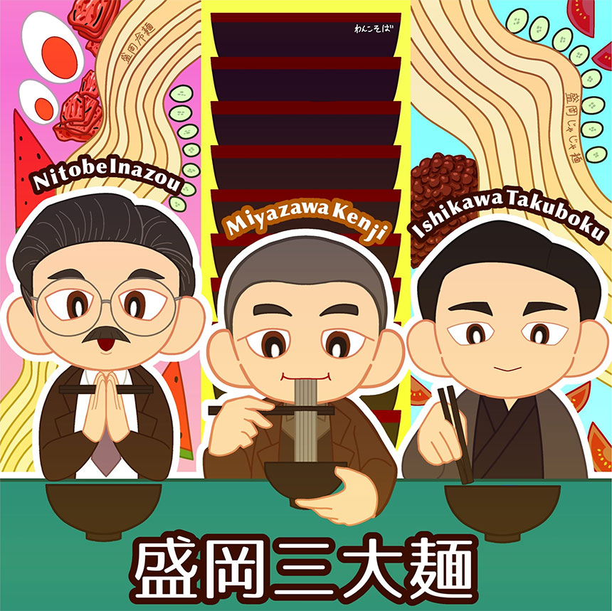 わんこそばの他にも有名な麵料理(盛岡冷麵、盛岡じゃじゃ麵)があったので、それを描きました。また、岩手ゆかりの人物(左から新渡戸稲造、宮沢賢治、石川啄木)を描きました。