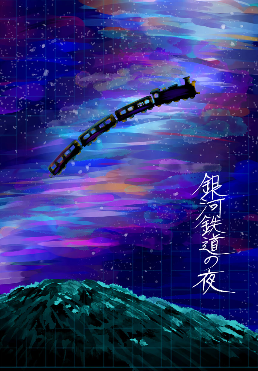 好きな作品である『銀河鉄道の夜』を描きました。天の川の上を通る鉄道を目立たせるために、ベタ塗りに近い書き方にしました。天の川の周りには作中に登場した星座が描かれており、上から南十字、さそり、白鳥です。下に描いた丘は最後に登場する丘です。遠近感のために描きました。効果として原稿用紙を薄く乗せています。