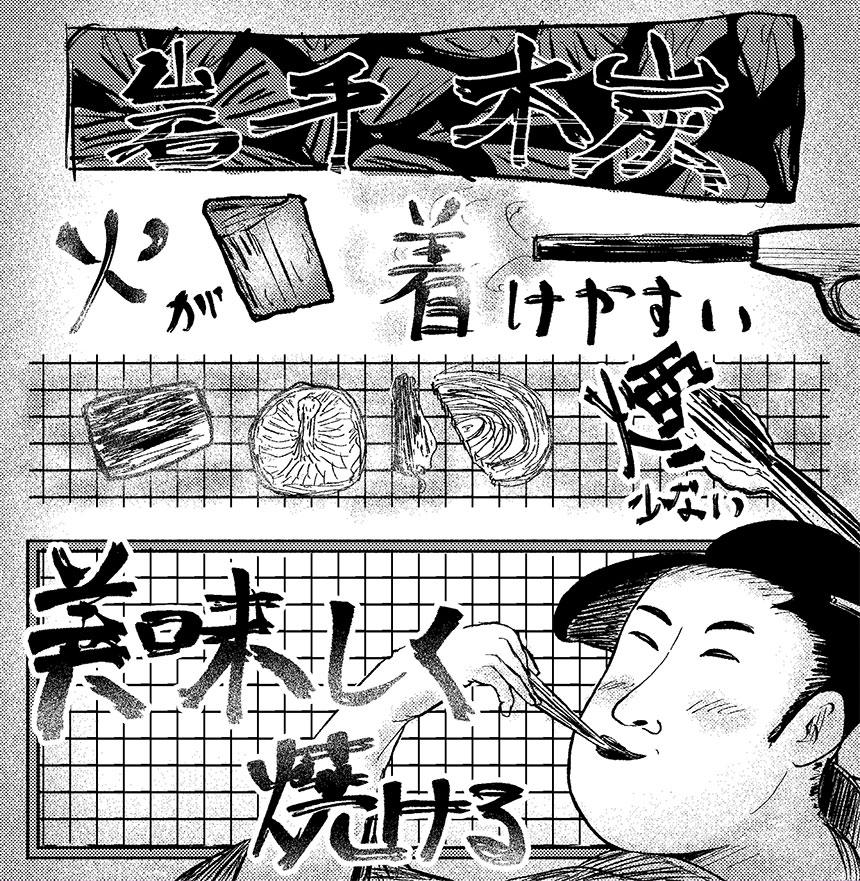 広大な森林をもつ岩手県には、木炭の原料となるナラが豊富にあるそうです。「岩手木炭」の特徴は、まさにこのマンガデザインのように火付き、火持ちに優れ、美味しく焼けるそうです。木炭なのでモノクロがよく合うマンガコマ割りで効果効能がしっかり表現されていますね。