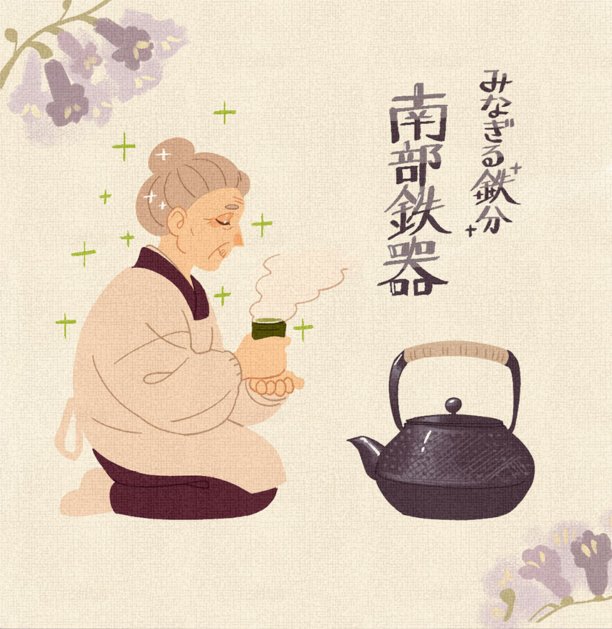 南部鉄器を使った料理を食べていると、心臓の寿命が実年齢より若くなるという面白い情報を知りました。鉄器から鉄分が豊富に摂れるからだそうです。南部鉄器と健康なおばあちゃんを描きました。桐の花は県花です。