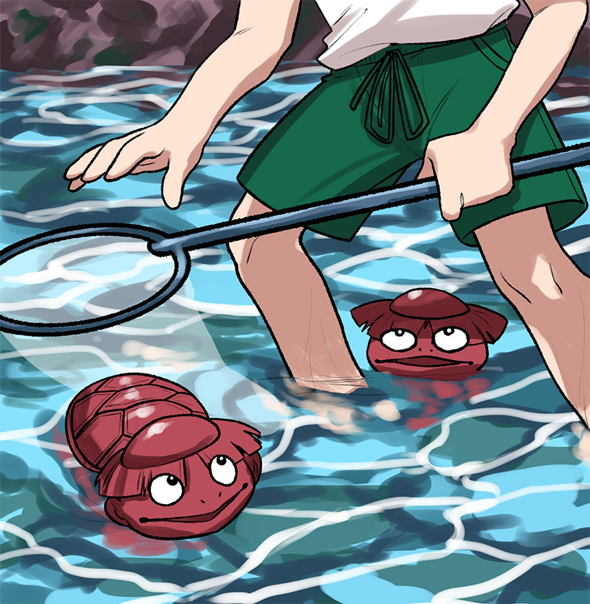 2021年7月、世界的建築家の安藤忠雄さんが東日本大震災の被災地の文化復興拠点として、岩手県遠野市に子ども向けの図書施設「こども本の森 遠野」を建築しました。その、「遠野と東北」のコーナーには「遠野の川には、河童が多く棲んでいるのだ。」と書かれていました。まさに、このフレーズ通りのマンガデザインに心踊らされました。絵本のようなワンシーンです。