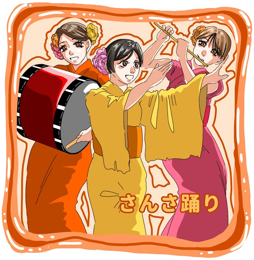 岩の手形が岩手県の由来なのですね、そしてその岩(三ツ石)の回りを「さんささんさ」と踊るさんさ踊り。しっかりとした制作意図で描かれた楽しさと美しさ溢れるマンガデザインです。