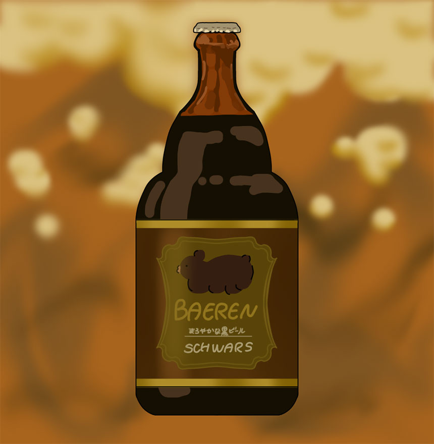 国際ビールコンクールで1位を獲得したベアレンシュバルツを描きました。飲み物自体は真っ黒で苦そうなのに、スッキリしていてまろやからしいです。背景はビールの泡と、コーヒーの苦味とカラメルの甘さを色で表現しました。
