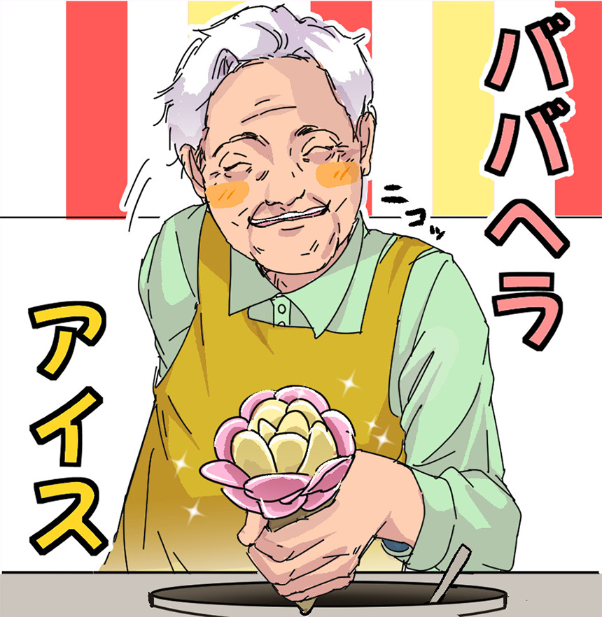 「ババヘラアイス」初めて聞きました。調べてみるとまさにこのマンガデザイン作品のように、売り子さん(おばあちゃん)がヘラでアイスを盛ることから名付けられたそうです。「絵のように」とはまさにこのことを言うのですね。