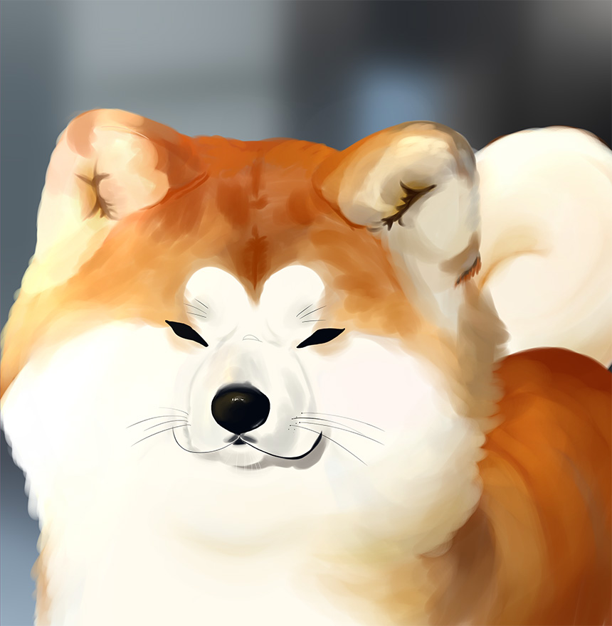 秋田犬の特徴を全て入れつつ、幸せな雰囲気にしたかったので温かみのある色で光を入れました。