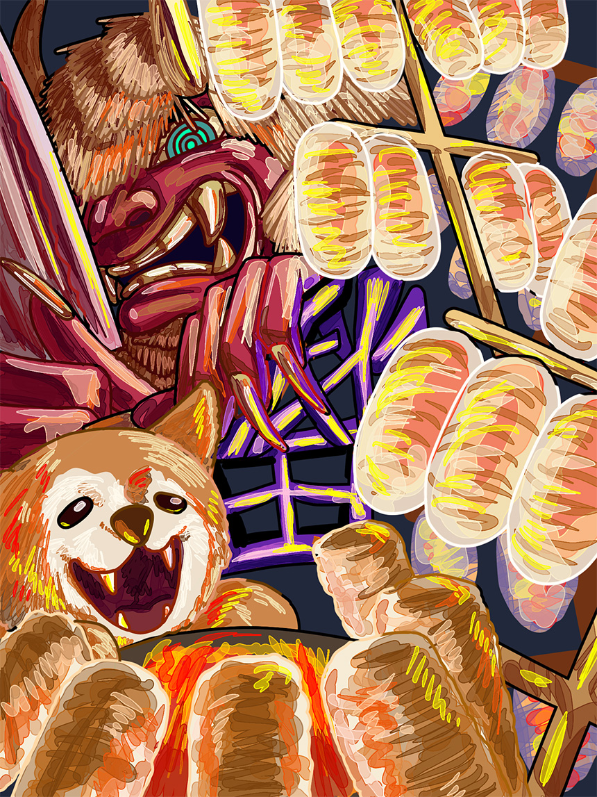 秋田県と言えばきりたんぽだと思って描きました。美味しそうに見えるよう、イラスト感よりリアル感強めで色を塗りました。