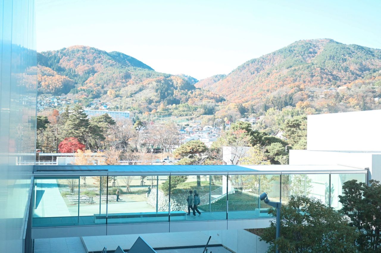 この、公園や周辺の環境との調和が、美術館の大きな魅力です。本館と「東山魁夷館」をつなぐ渡り廊下からは、季節ごとに色々な表情を見せる山々が見渡せます。
