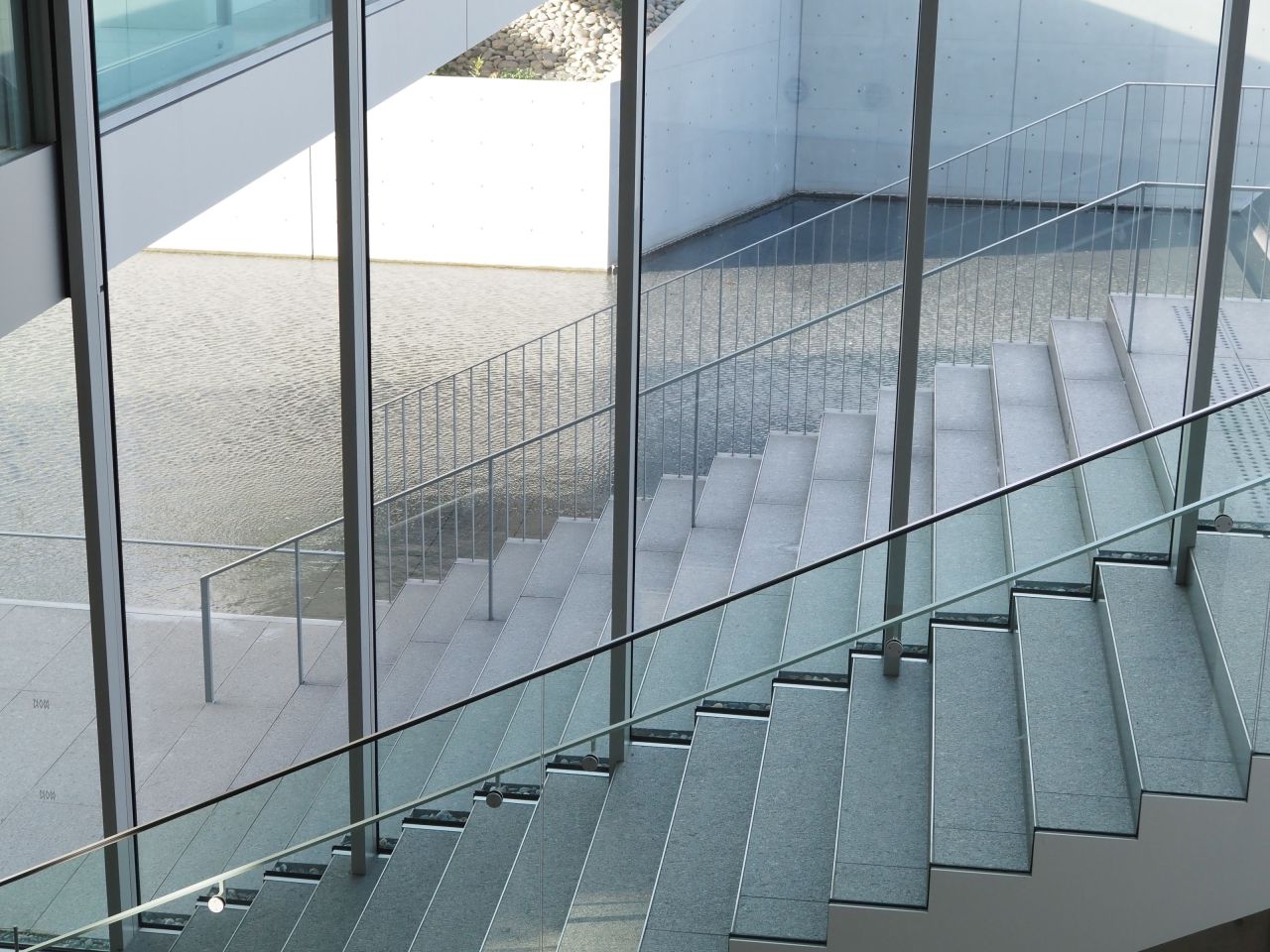 出迎えてくれるのは、空間的ゆとりを感じるエントランスホール。たっぷりと光が差し込む吹き抜けには、外に設けられた[水辺テラス]と館内の一体感を演出する、印象的な階段。暖かい時期、テラスは水をたたえて水面がキラキラと揺れ、美しい光を見ることができます。時間帯によってエントランスホールにできる影もまた、とても情緒的です。