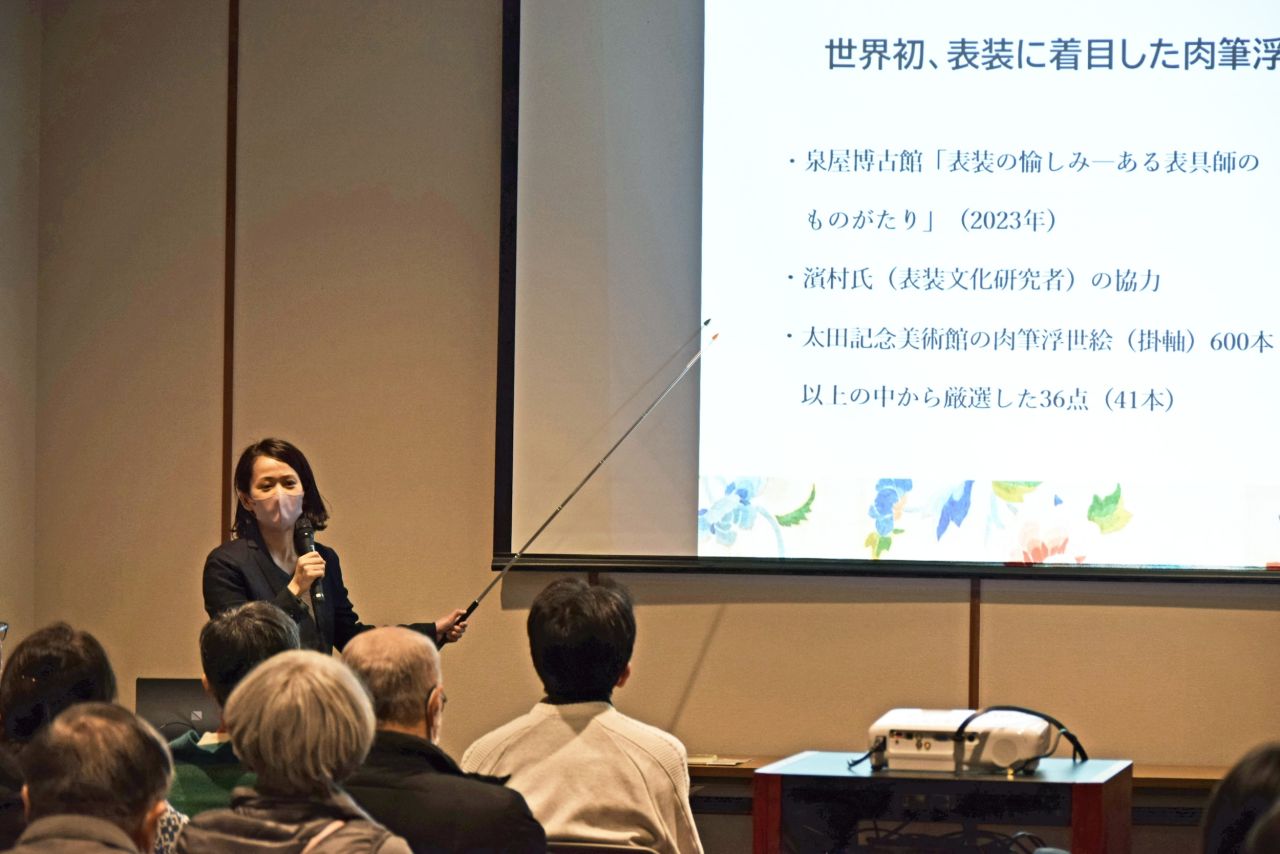 掛軸の裂地やデザインなど、肉筆浮世絵の表装に着目した世界初の展覧会「表装 ―肉筆浮世絵を彩る」に足を運び、担当学芸員さんによるスライドトークを体験取材しました。
