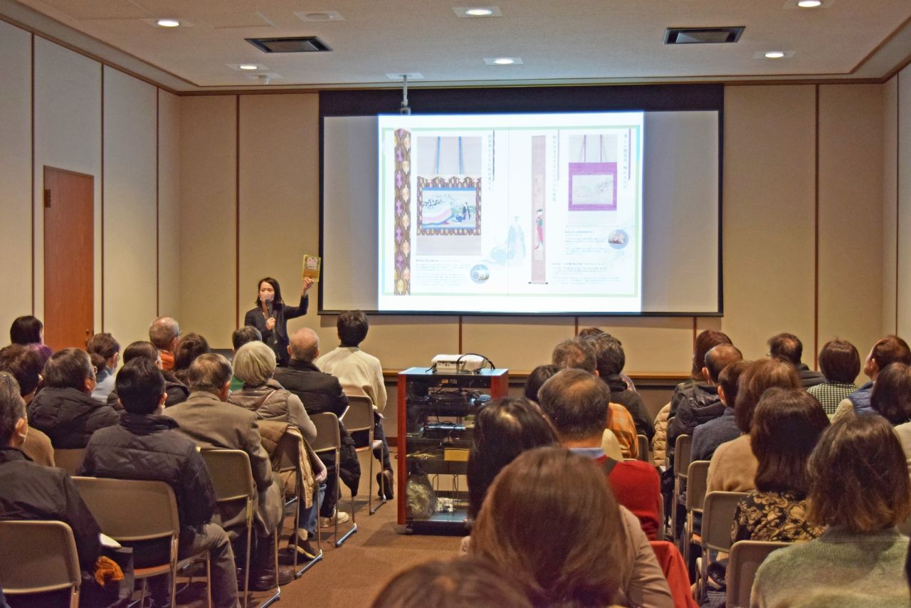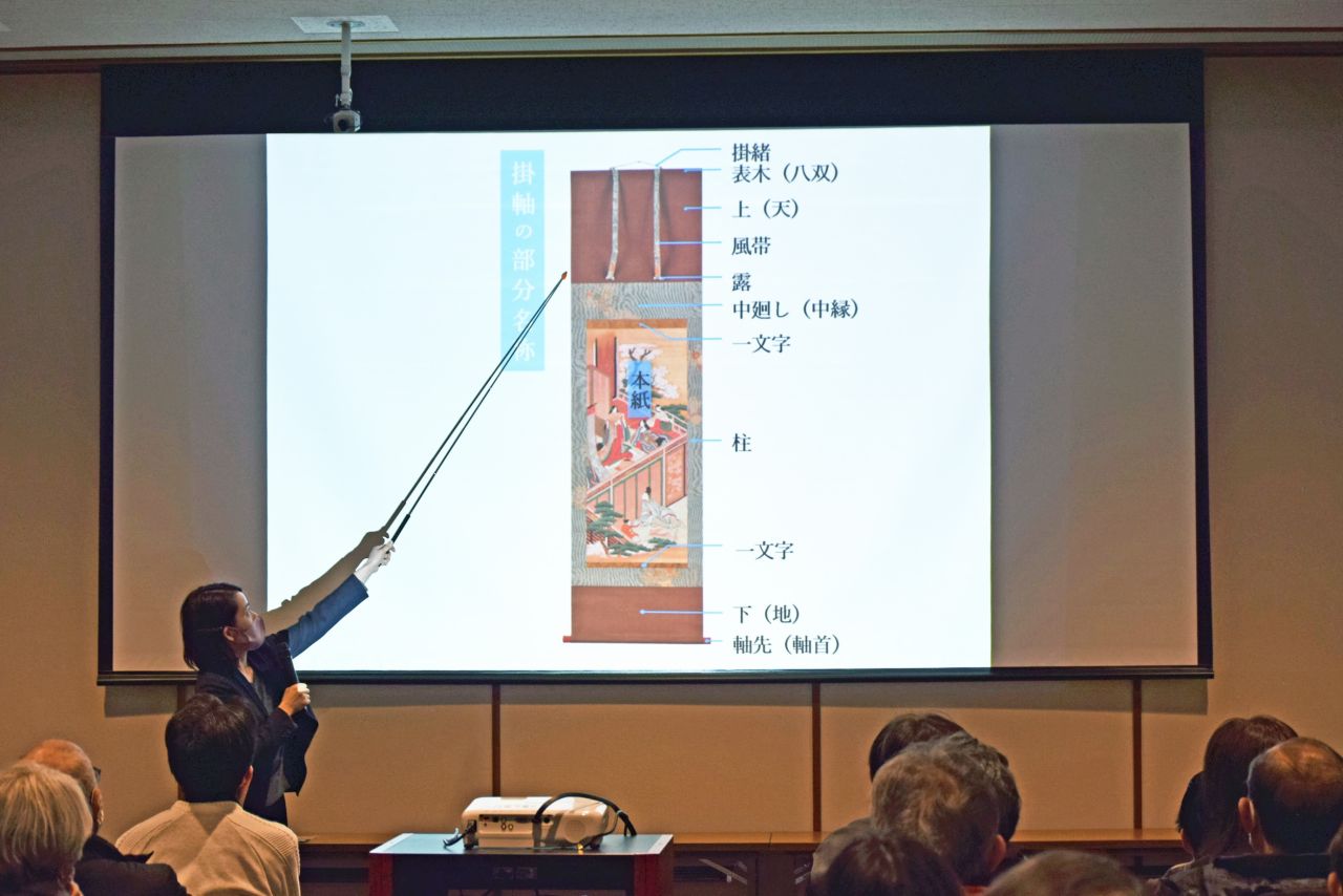 掛軸の各部分の名称を説明する、学芸員の赤木美智さん。今回の展覧会を楽しむにあたって、基礎的なポイントも学べるため、初心者の方も参加しやすいイベントです。