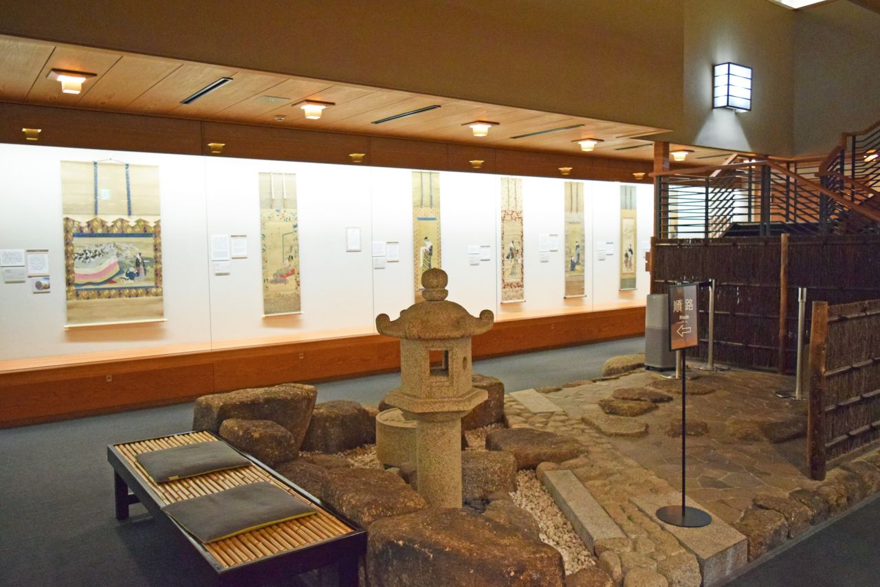 「表装 ―肉筆浮世絵を彩る」展示風景。1階展示室の中央には、枯山水風の小さな庭園があり、和の空間を体感できます。