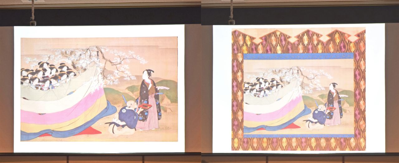 勝川春章《桜下詠歌の図》。本紙のみ(左)が投影された後、中廻し(ちゅうまわし)が施された状態の写真(右)が登場。表装が作品の雰囲気を際立たせているのだと実感しました。