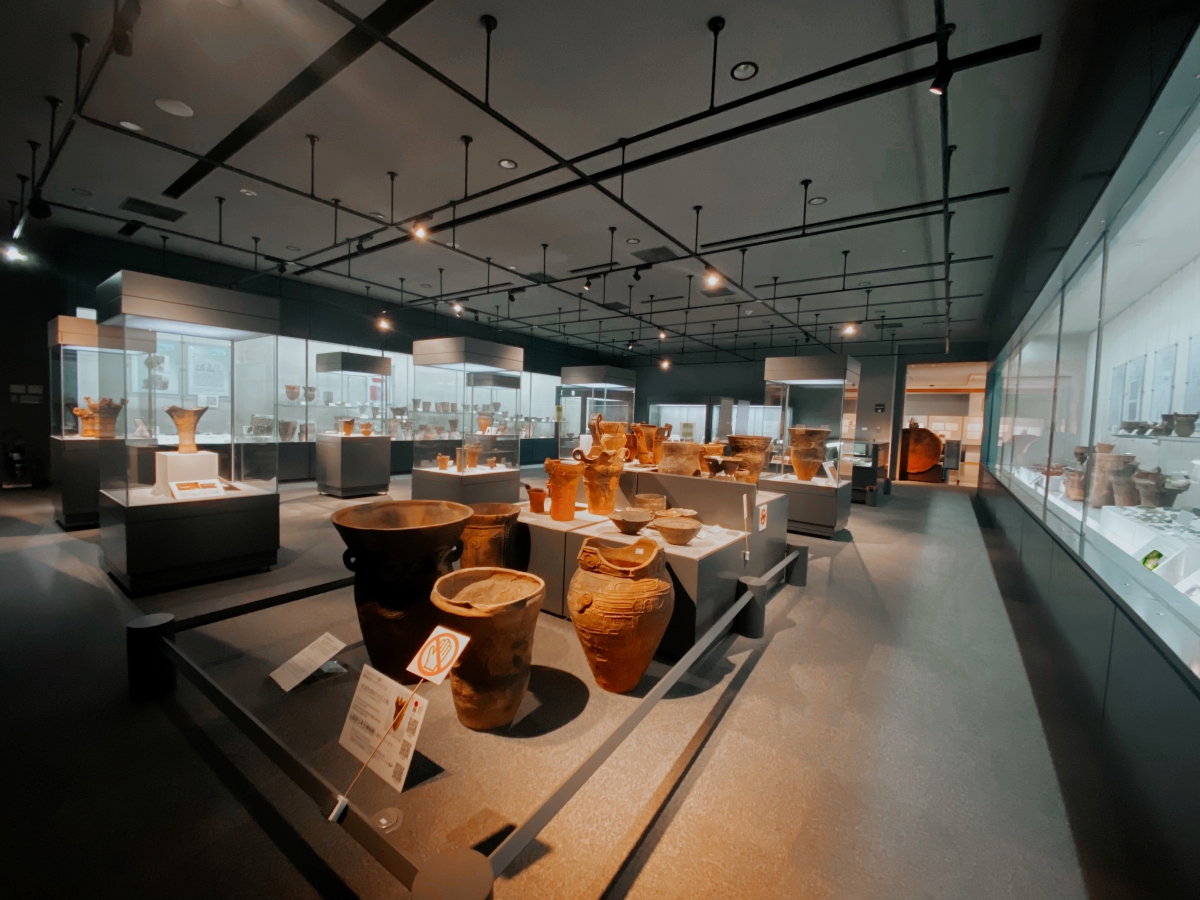 たくさんの土器などが並ぶ展示室、市民による土器作りのサークル活動もあるという。