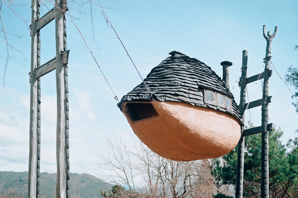 世界的建築史家・建築家である藤森照信の地元でもあるこのエリアには、彼の手がけた建築群が点在しています。茶室として手がけられた3つの建築、「空飛ぶ泥舟」「高過庵」「低過庵」は諏訪市博物館の近隣にあります。「空飛ぶ泥舟」はまるで空を飛んでいる宇宙船のようなフォルム。その近くにある高さ6メートルの木の上に立つ「高過庵」と、地面に半分埋まっている「低過庵」は、それぞれの対比でより魅力が引き立っています。尖石縄文考古館の近くには、“藤森式”竪穴式住居としてワークショップ参加者と共に完成させた「古過庵」があります。プリミティブで、どこか懐かしくて、あたたかい。そんな藤森建築めぐりに出かけてみては。