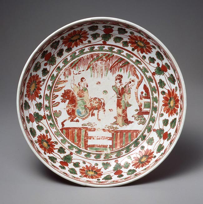 五彩とは、白磁などの素地に透明釉を掛けて焼いたのち、その上に赤や黄・緑などの上絵具で文様を描いて焼き付けた中国のやきものです。古赤絵(こあかえ)とは、万暦年間(1573-1620)以前の景徳鎮民窯(けいとくちんみんよう)の五彩製品を指す日本での名称です。見込みには樹の下の女性と馬に乗る男性を上絵付けのみで描いており、小説か演劇の一場面を表しているようです。周囲には菊唐草文がめぐっています。高台内には赤で「陳文顕造」の陶工名らしき銘があります。明時代の作品の中で、こうした銘があるものは珍しいものです。