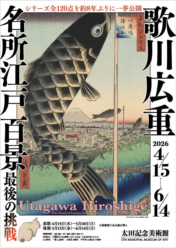 広重が還暦を迎えてから62歳で没するまでの3年間に手掛けられた本作は、一部は死後に出版されたという、まさに絶筆とも言える作品でした。本展では、初代広重が手掛けた118図に、二代広重が描いた1図、および目録を加えた全120点を前後期に分けて公開。太田記念美術館所蔵の「名所江戸百景」は国内でも指折りとなる、きわめて良好な保存状態と美しい彫摺を誇り、名作の全貌を間近で堪能できる、またとない機会となるでしょう。